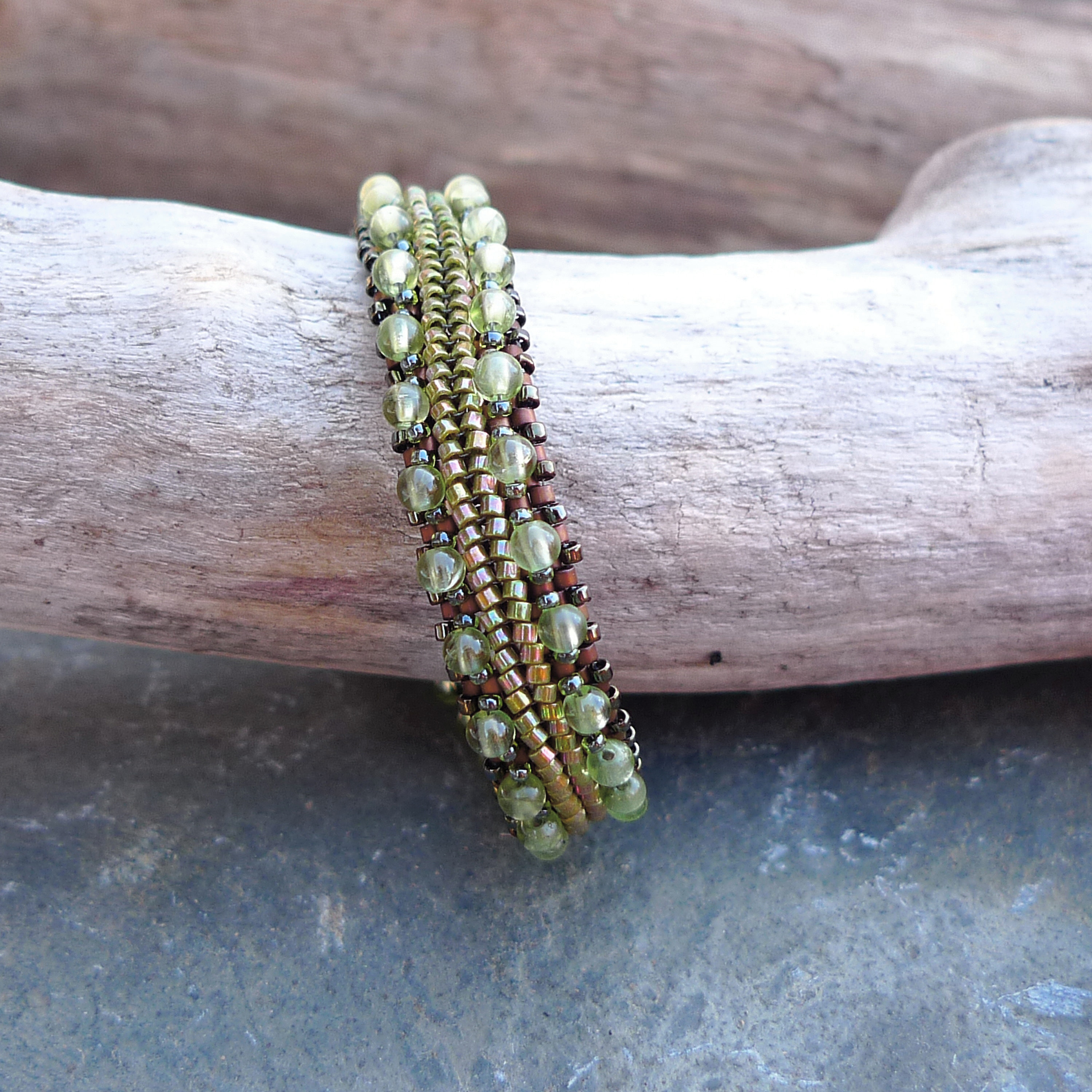 Viridescent peridot gemstones are hand woven atop Japanese Miyuki beads in shades of antiqued copper and golden spring green. This bracelet has a woven toggle clasp with a lovely silk tassel in moss green dangling from the loop.