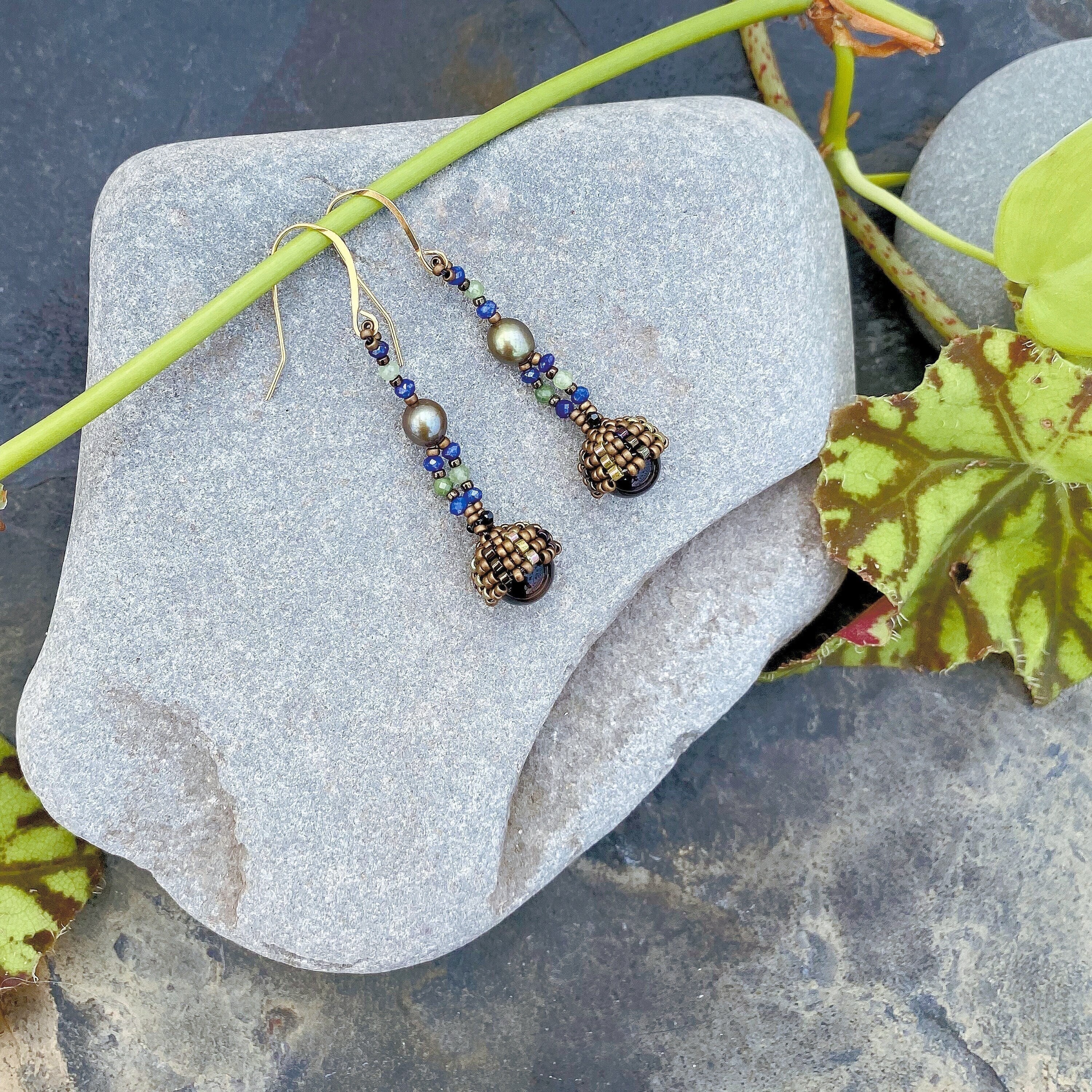 Onyx, freshwater pearl, lapis lazuli, green garnet, natural spinel and Japanese Miyuki beads are woven together to create these lovely earrings with a vintage style. Gold filled ear wires.